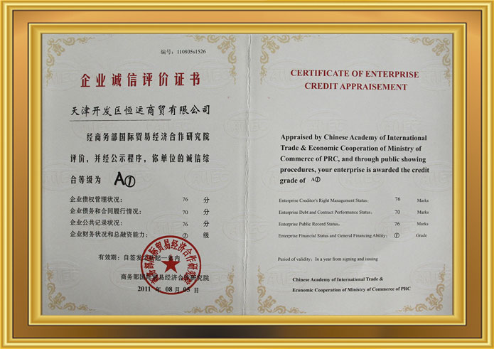 中国商务部国际贸易经济合作研究院给予公司“企业诚信综合评价等级A1级评级”