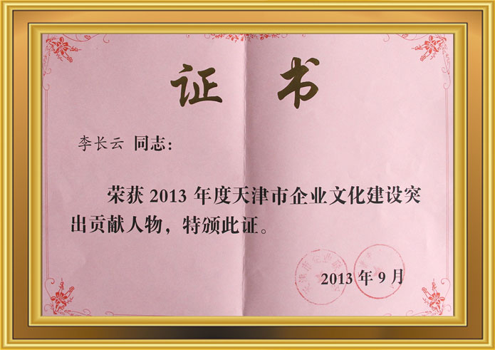 天津市企业联合会、天津市企业家协会授予李长云主席“2013年度天津市企业文化建设突出贡献人物”荣誉称号