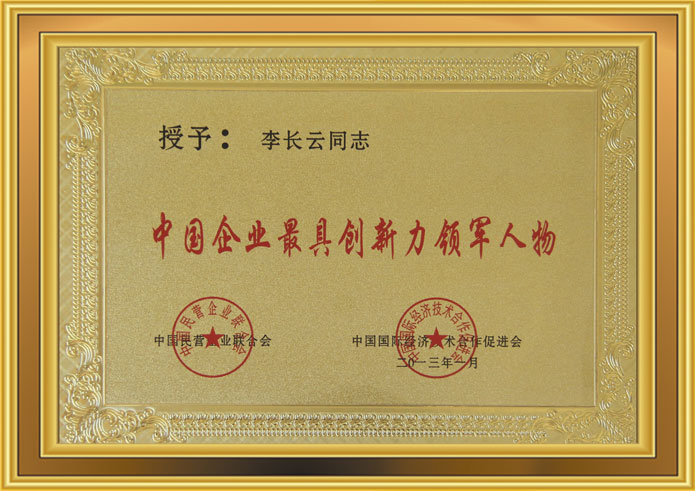 中华民营企业联合会、中国国际经济技术合作促进会授予李长云主席“中国企业最具创新力领军人物”荣誉称号