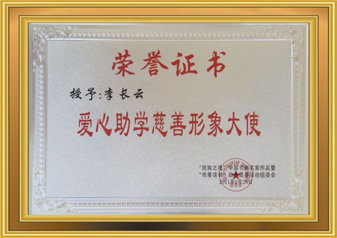 “民族之魂”中国书画名家作品暨“我要读书”助学慈善活动组委会授予李长云主席“爱心助学慈善形象大使”荣誉称号