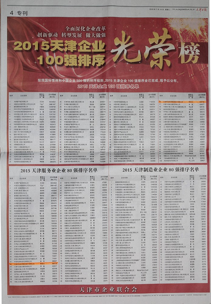 2015年7月14日,天津日报公布,按照国际惯例和中国企业500强的排列规则,2015天津企业100强排序业已完成。天津恒运能源集团股份